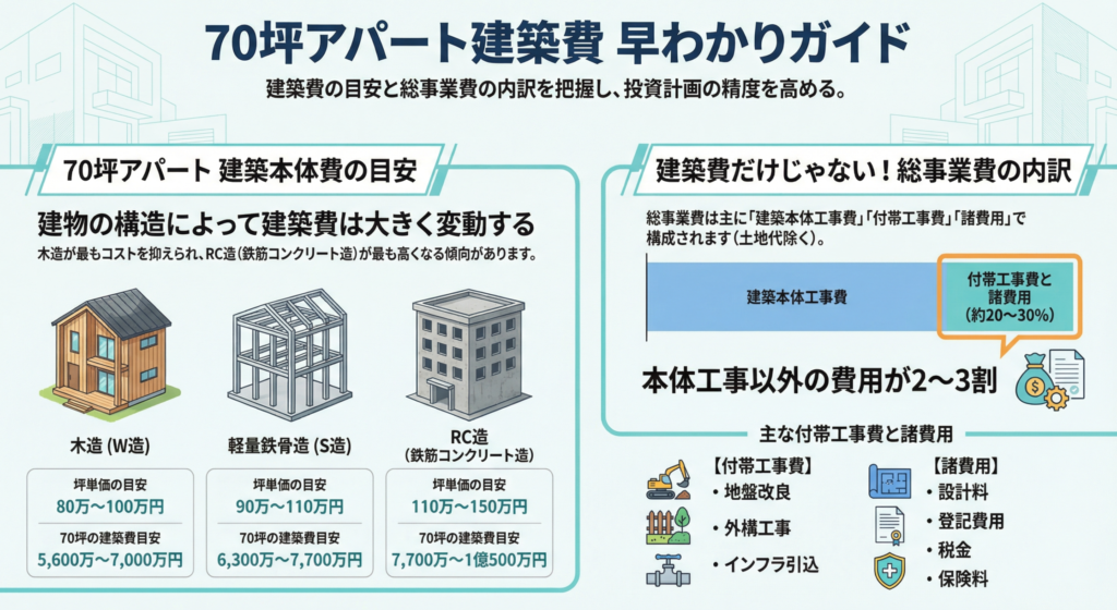 70坪のアパート建築費は、数千万円から1億円を超える規模になります。この費用は、建物の構造や階数、設備のグレードによって大きく変動するため、まずは全体のコスト構造を正しく理解することが重要です。建築費は大きく「本体工事費」「付帯工事費」「諸経費」の3つで構成されており、それぞれを把握することが、失敗しないアパート建築の第一歩となります。